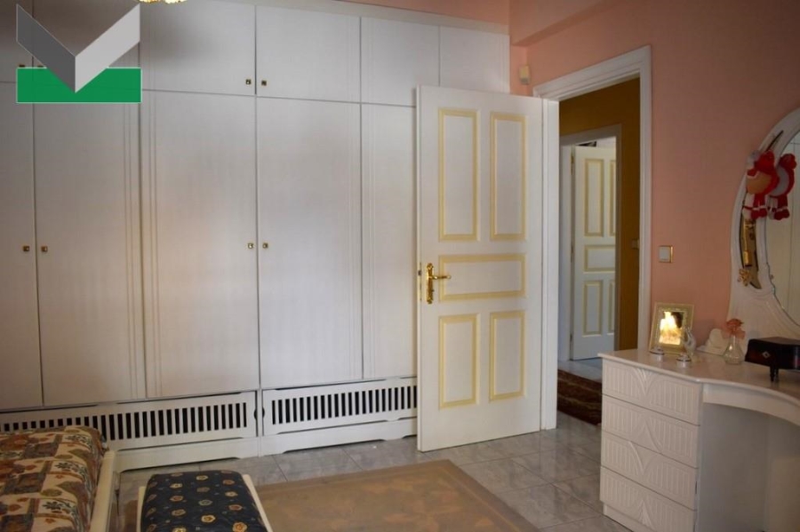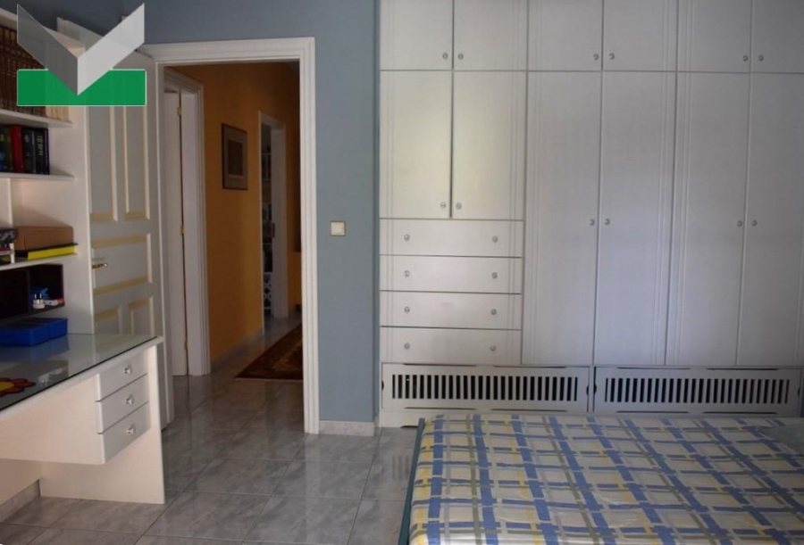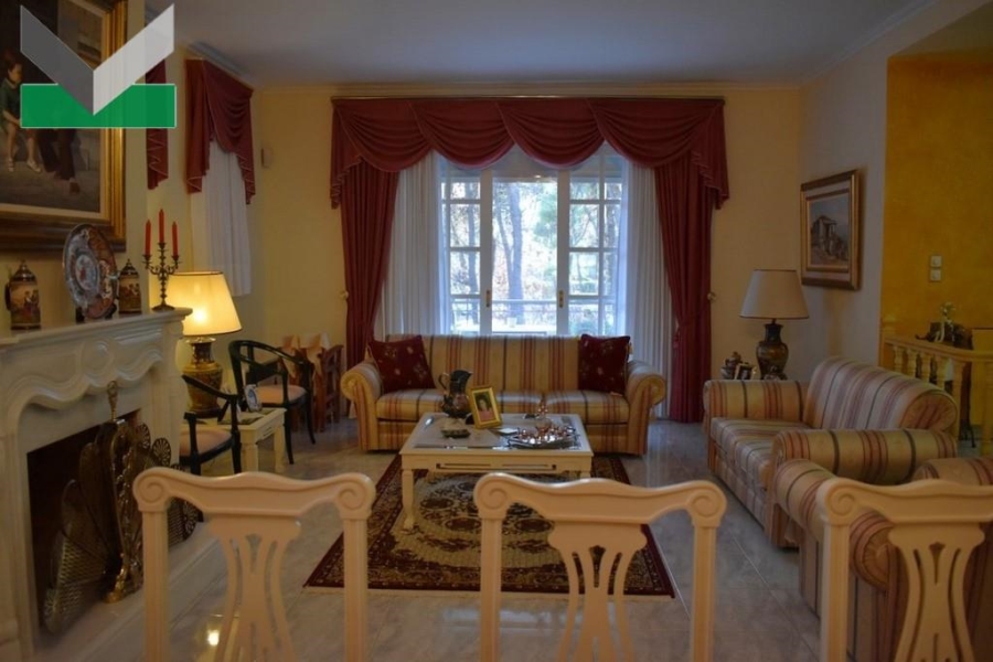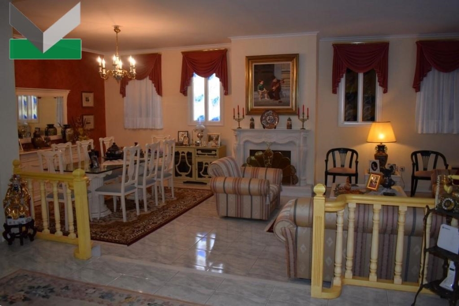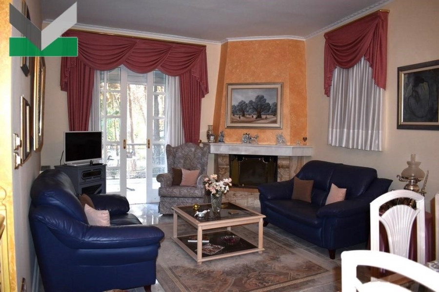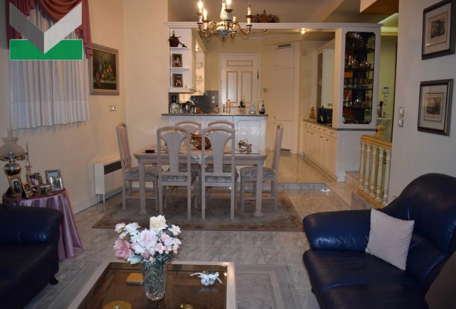ΥΠΕΡΥΨΩΜΕΝΟ ΙΣΟΓΕΙΟ - ΔΙΑΜΕΡΙΣΜΑ (184,59 τμ.): Από την κεντρική είσοδο του κτιρίου και τον χώρο κλιμακοστασίου (10,34 τμ.) οδηγούμαστε στην είσοδο του διαμερίσματος. Περιλαμβάνει άνετο χώρο καθιστικού-τραπεζαρίας με τζάκι και μεγάλη μπαλκονόπορτα στην πρόσοψη. Ενιαία, εντοιχισμένη κουζίνα με ηλεκτρικές συσκευές, πάσο προς το σαλόνι και πόρτα εξόδου προς την αυλή. Επιπλέον, καθιστικό/χώρος φαγητού κουζίνας με τζάκι και 2η μπαλκονόπορτα στην πρόσοψη. Τρία (3) μεγάλα υ/δ με μπαλκονόπορτες, 2 λουτρά (ένα με μπανιέρα και το άλλο με ντουζιέρα). WC με θέση πλυντηρίου. Δάπεδα πλακάκια. Η εσωτερική μαρμάρινη σκάλα του κτιρίου οδηγεί στον όροφο.