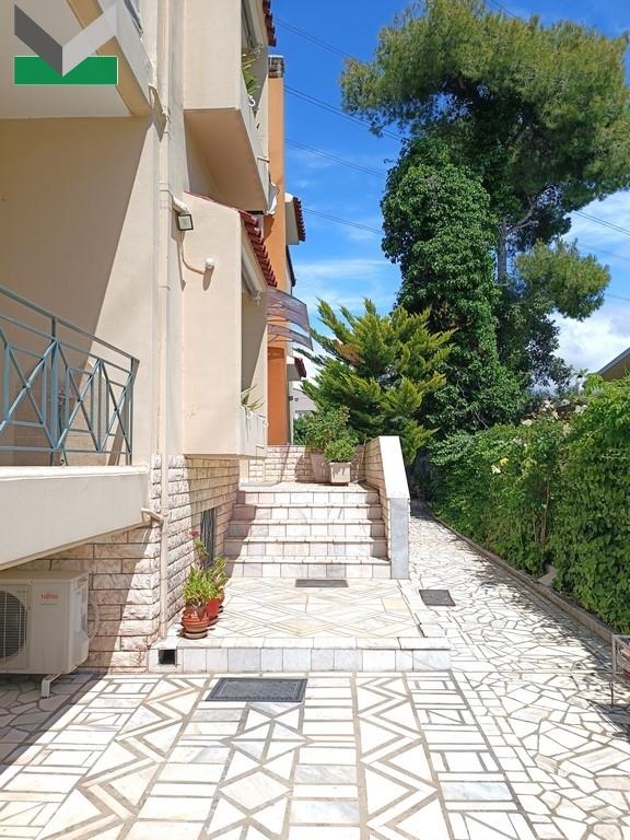 ΥΠΕΡΥΨΩΜΕΝΟ ΙΣΟΓΕΙΟ (153 τμ.): Διαμέρισμα με ενιαίο καθιστικό/τραπεζαρία και ανοικτή κουζίνα με παράθυρα και εντοιχισμένες ηλεκτρικές συσκευές (κουζίνα, φούρνος, ψυγείο, πλυντήριο πιάτων). Μπαλκόνι στο σαλόνι προς την πρόσοψη του κτιρίου και παράθυρα. Από το χωλ οδηγούμαστε σε μικρή βεράντα με πόρτα εξόδου προς τον κήπο. Υ/δ master με μπαλκόνι και μπάνιο (μπανιέρα). Επιπλέον, 2 υ/δ με μπαλκόνι. Δωμάτιο-ντους με νιπτήρα και παράθυρο. Επίσης, μπάνιο με μπανιέρα. Δάπεδα πλακάκια. Η εσωτερική μαρμάρινη σκάλα του κτιρίου οδηγεί στον όροφο.