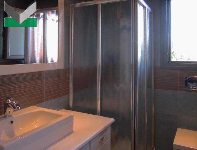 ΙΣΟΓΕΙΟ: 170 τμ περιλαμβάνει μεγάλο χώρο υποδοχής (ύψος 6,00 μ.) με ενεργειακό τζάκι. Αυτό το χώρο πλαισιώνουν μεγάλοι υαλοπίνακες οι οποίοι παρέχουν άπλετο φως και θέα προς τον κήπο και την πισίνα. Σε συνέχεια αναπτύσσεται η άνετη, φωτεινή κουζίνα -με έξοδο στον πίσω κήπο- εξοπλισμένη με εντοιχισμένα ντουλάπια λάκα (Ιταλίας) με ηλεκτρικές συσκευές Miele και χωριστό χώρο φαγητού. Υπάρχει επίσης δωμάτιο για ξενώνα και W.C. Δάπεδα γρανιτοπλακάκια. Αρχοντική σκάλα από κόκκινο χαλαζία οδηγεί στον όροφο.