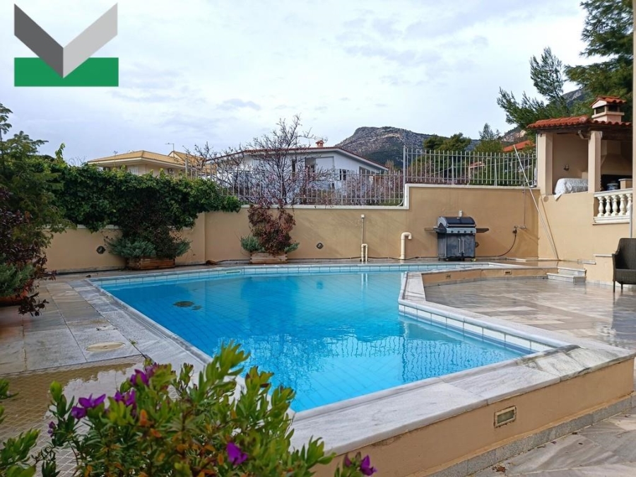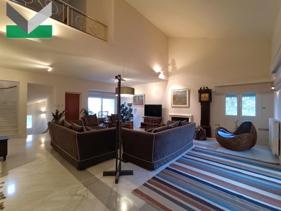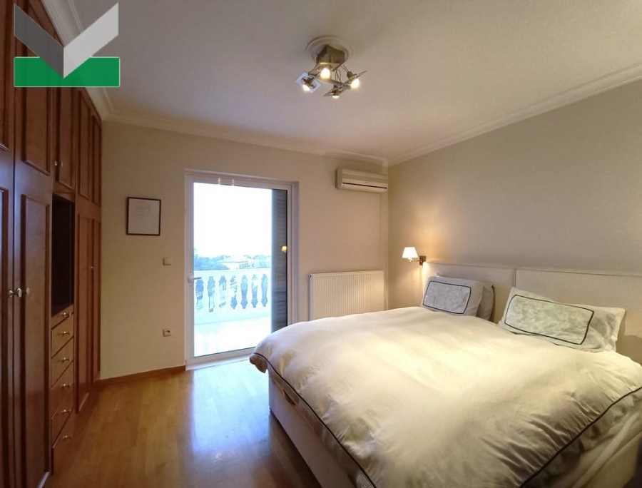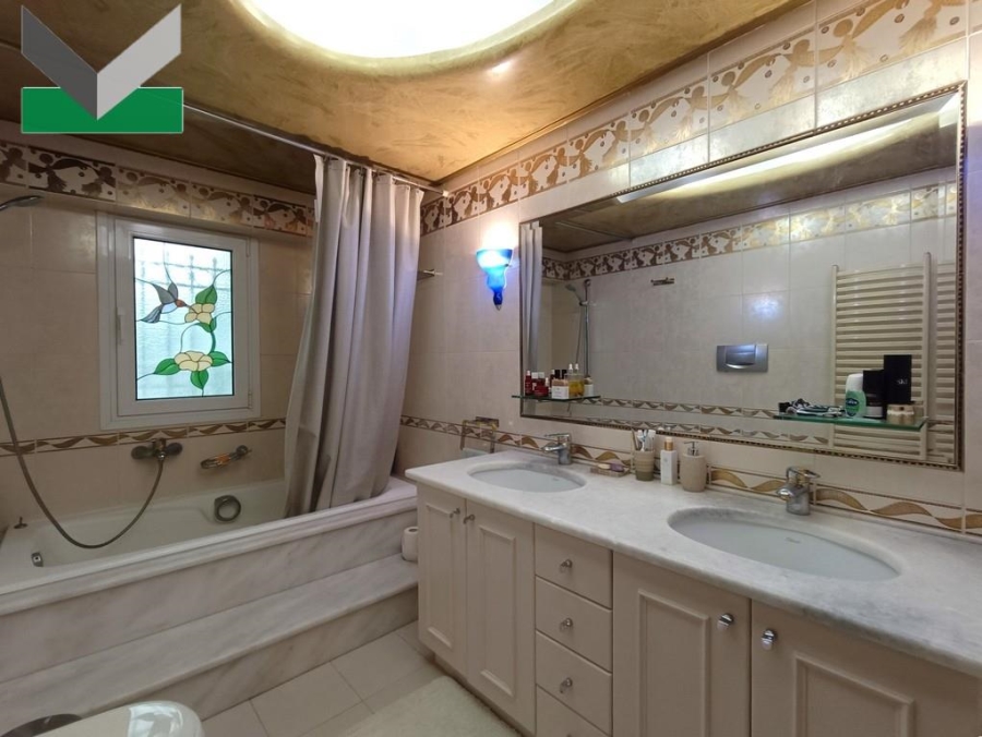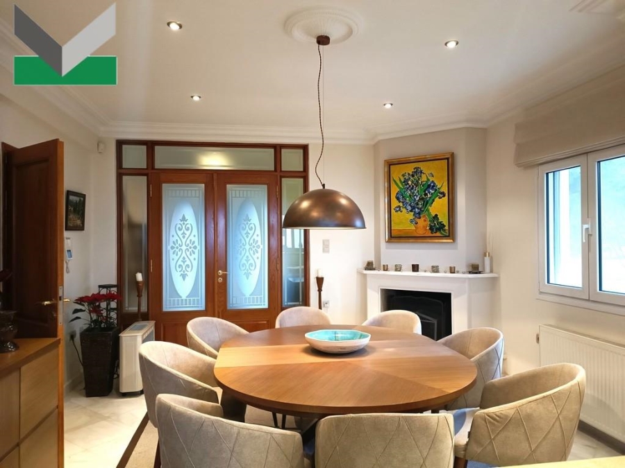 1st STOREY (elevated ground-floor): The front door provides access to the entrance hall and the spacious lounge/dining area with fireplace. Glass sliding doors lead out to the sizeable terrace and the patio, overlooking both the Attica basin and Mt Parnitha. The separate kitchen with fully renovated fitted cupboards comes with a breakfast/lunch/family area with fireplace. A walnut pair door with lovely frosted etched glasses grants access from the kitchen area to the entrance hall. A 2nd door leads to the living room and a 3rd one to the balcony. A guest WC area completes the storey. The interior marble staircase or elevator runs upstairs.
