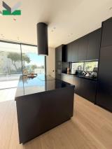 RAISED GROUND FLOOR (125 sqm): The front door provides access to an ample, open-plan, high ceiling room comprising a lounge area with a highly energy-efficient, natural-gas fireplace. A floor-to-ceiling, double-panel, glass sliding door opens onto a patio offering direct access to the garden and the pool. There is an open-plan, state-of-the-art kitchen with fitted cabinets, CORIAN brand countertops as well as built-in electric appliances. An island equipped with extra cabinetry separates the kitchen from the dining area. A second ceiling-height, sliding door leads to outdoor living spaces. A guest WC area completes the storey. Wooden floor throughout. The stylish, wooden staircase or the lift runs upwards towards the 1st floor.