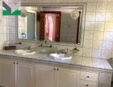 1st RESIDENCE -ELEVATED GROUND FLOOR (151.15 sqm): The front door provides access to the reception room encompassing a lounge area with a fireplace and window seats. Aptly designed separate kitchen with fitted cabinets (MODA BAGNO brand), built-in electric appliances (ceramic hobs, oven 90 cm., dishwasher 60 cm., microwave). Also window seats and ample lunch/family area. An exterior door leads outside (next to the front door). Additionally, a 2nd living/dining room with a wooden bar counter and fireplace. A guest WC area completes the storey. Marble and tile flooring. The interior oak staircase or the lift runs to the upper storey.