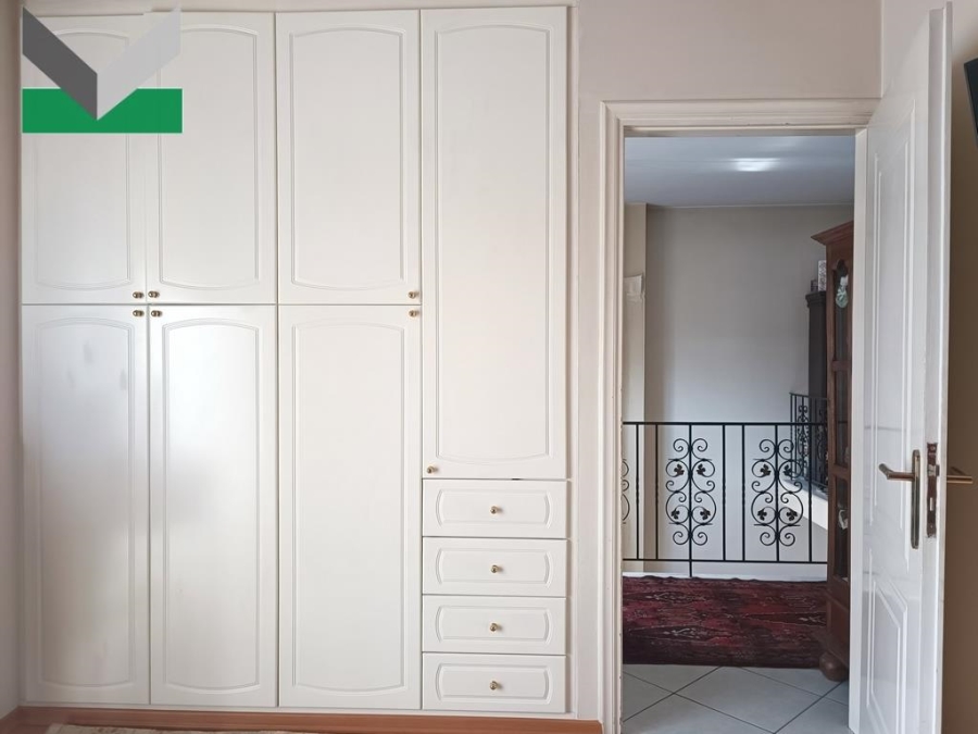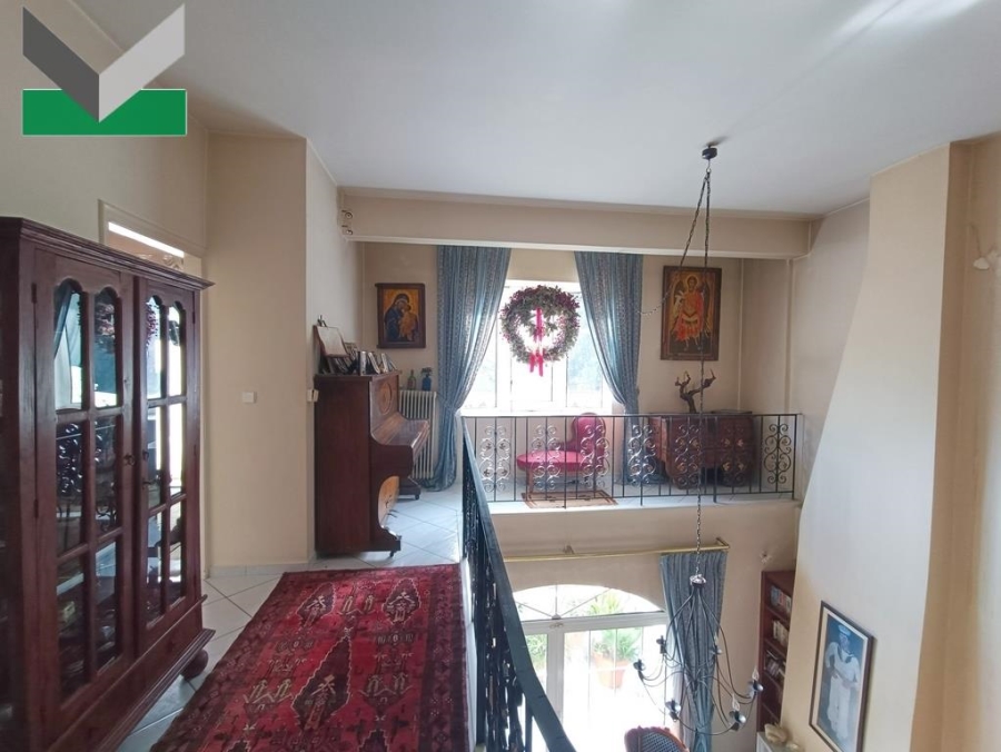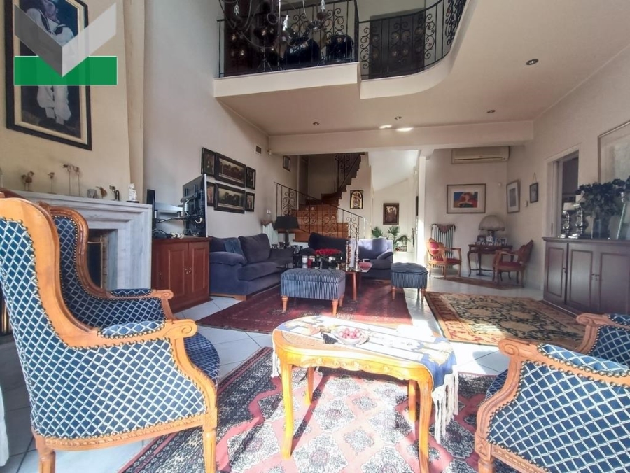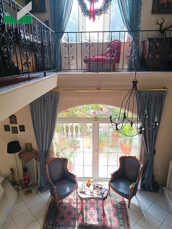FIRST FLOOR: An independent external entrance leads, via an internal marble staircase, to the first floor. The property features a spacious living room with a fireplace and an impressive double-height ceiling extending to the second floor. A double balcony door provides access to a corner balcony with two open aspects.Two steps lead up to the dining area, which benefits from a window and direct access to the kitchen. The separate kitchen with fitted cupboards includes a breakfast area and two additional doors leading to the balcony and the living room respectively. Floors are tiled throughout. There is also a guest WC on this level. An internal oak staircase with a handcrafted wrought-iron handrail leads to the upper floor.